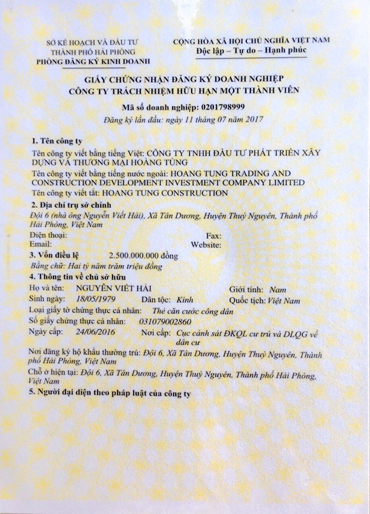 CÔNG TY TNHH ĐẦU TƯ PHÁT TRIỂN XÂY DỰNG VÀ THƯƠNG MẠI HOÀNG TÙNG được thành lập theo giấy phép kinh doanh số 0201798999 do Sở Kế Hoạch và Đầu Tư Thành Phố Hải Phòng cấp ngày 11 tháng 7 năm 2017.